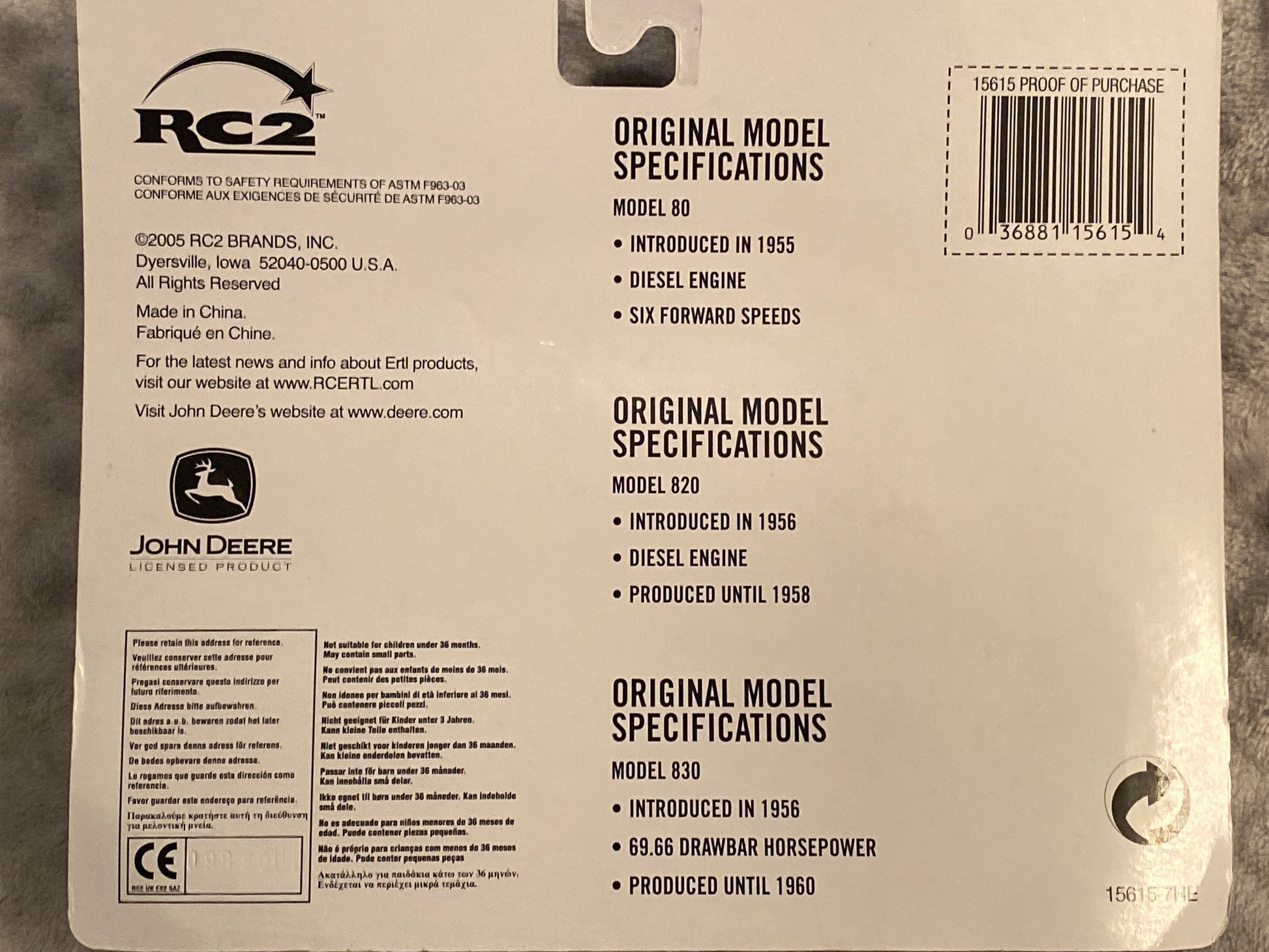 1/64 scale John Deere tractor 3 pack. Has 80, 820, and 830 tractors.